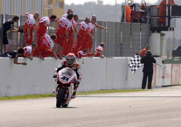 In gara due sia Noriyuki che Michel sono scattati brillantemente, l’italiano ancor meglio del giapponese. Per due giri Michel ha mantenuto il comando fino a quando è stato superato sia dal compagno di squadra, sia da Ben Spies. Dal sesto giro in poi le posizioni dei leader sono rimaste immutate, con Haga che ha nuovamente abbassato il record mentre controllava l’americano della Yamaha e Fabrizio che è riuscito a tenersi alle spalle un determinato Regis Laconi.