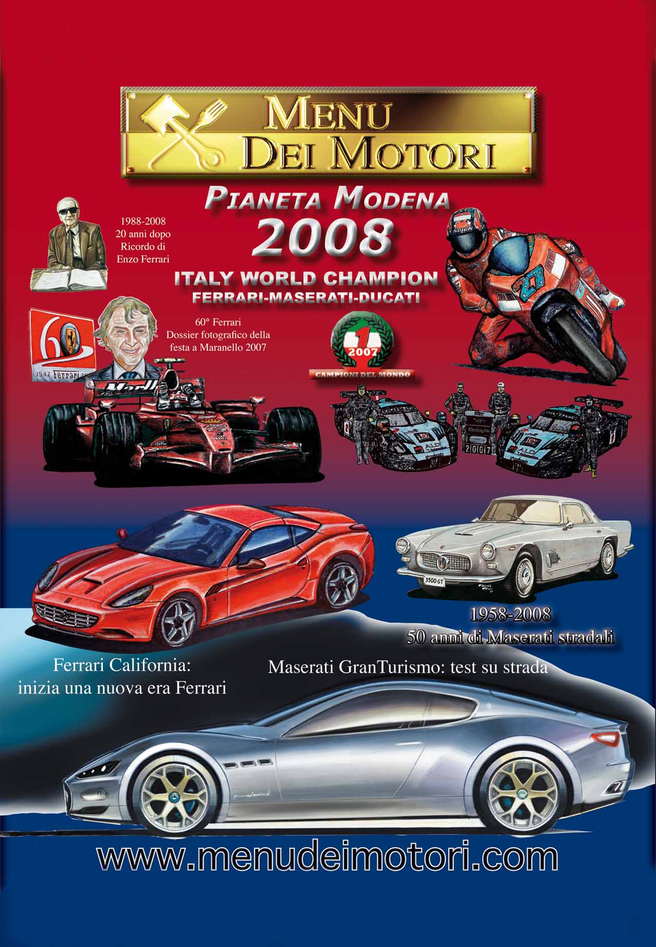 Un'idea che oggi, dopo la soddisfazione della collaborazione da parte di tutte le case automobilistiche e del Dipartimento di Ingegneria "Enzo Ferrari" dell'Università di Modena, ora ho il piacere di affidare anche a tutta la rete di librerie e negozi specializzati legati al grande evento di quest'anno, il 20° Anniversario dello stesso Menu dei Motori: certo che sapranno farla crescere ancora, a beneficio di tutto l'ambiente del "Pianeta Modena", ma soprattutto dei tanti collezionisti ed appassionati che leggono e collezionano il "Menu dei Motori".